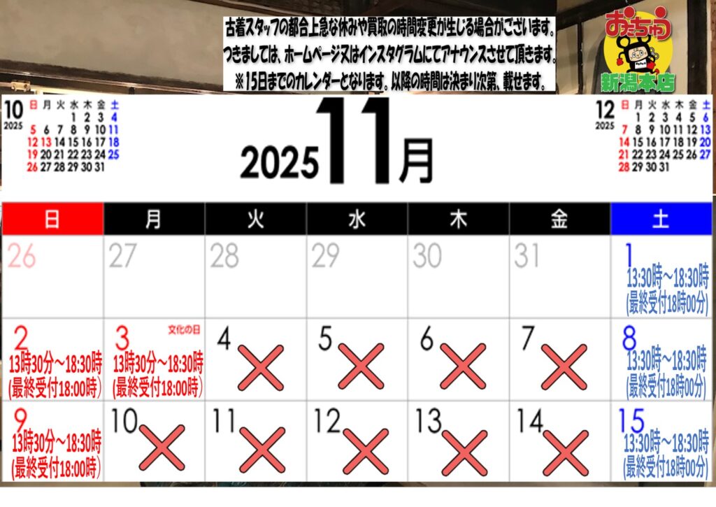 買取スタッフ不在の為11/4〜11/7まで買取受付を15時30分にさせていただ…