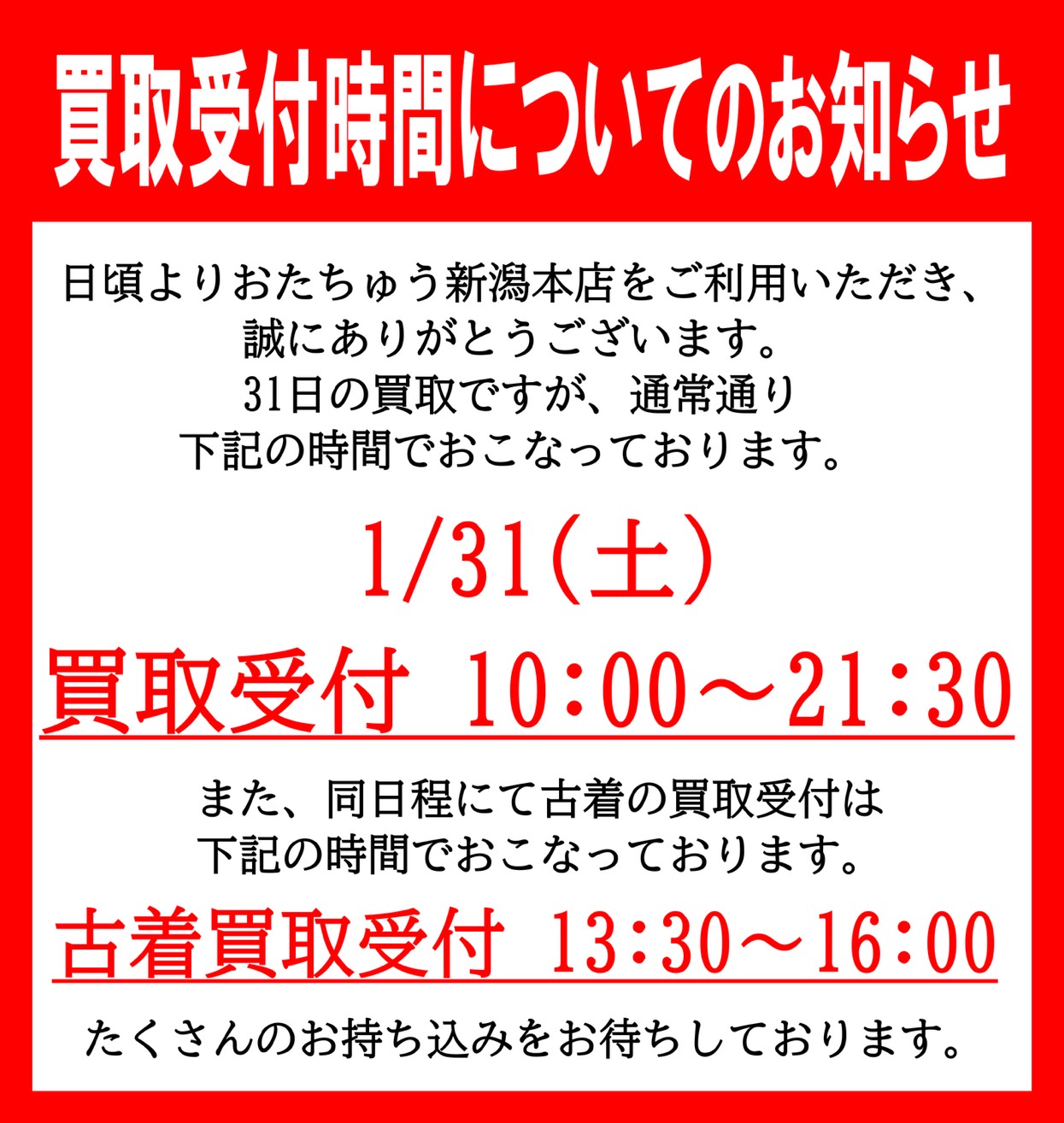 買取受付時間についてのお知らせ 1/31(土)の買取ですが、通常通り10:00…
