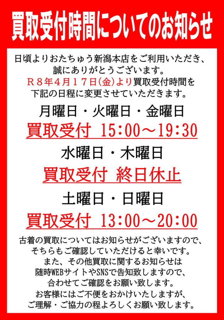 R8年3月より買取受付時間が変更になります R8年3月1日より買取受付時間…