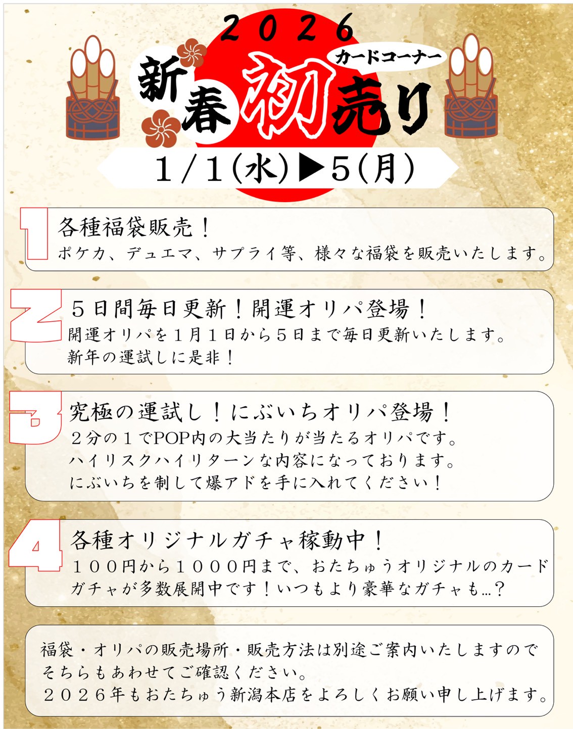 【1/1~1/5】🎍新年カードコーナー初売り🎍 イベント カード 2025年12月27日 🎍新年カードコーナー初売り🎍 2026年1月1日から福袋販売・オリパ販売を開始致します‼️ 1日に登場する予定のオリパも合わせて公開致しますので是非POPをご確認ください‼️ 新年もおたちゅう新潟本店をよろしくお願い申し上げます✨ **************** こちら↓もぜひチェックしてみてくださいね🎵 ・最新のイベント情報はこちら ・最新の買取情報はこちら