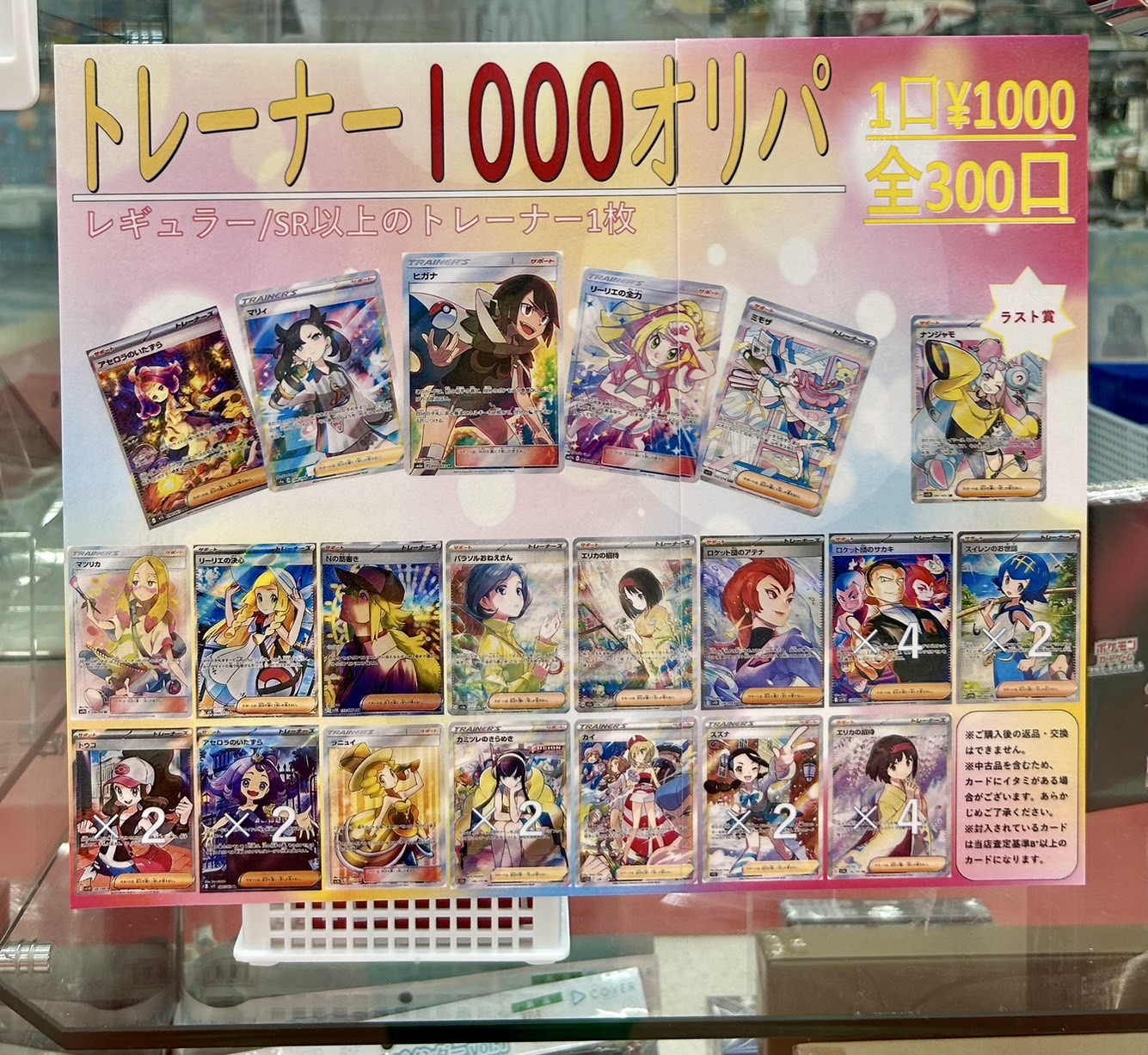 ■トレーナー1000オリパ カードコーナーショーケース内販売開始!■ カード 2025年9月18日 カードコーナーより 『トレーナー1000オリパ』をカードコーナーショーケース内で販売開始いたしました‼️ 当たりには大人気カードをたくさん盛り込んでおりますので是非チェックしてください✨️ ラストワンにはSR ナンジャモ 1枚をご用意しております😊 こちら300口限定の大人気商品となっておりますのでお早めにお買い求めください🙌 買取告知もまだまだ継続中です‼️ カードの高価買取ならおたちゅう新潟本店へ🔥🔥 ぜひお持ち込みください😁