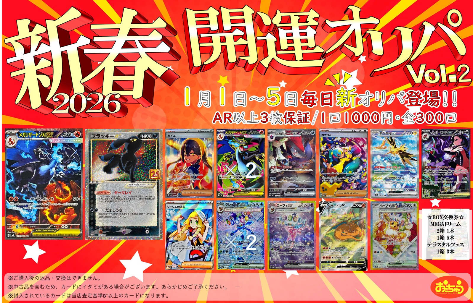 ■『開運オリパVol.2』をカードコーナーで販売開始しております!■ カード 2026年1月2日 カードコーナーより 『開運オリパVol.2』をカードコーナーで販売開始しております! おひとりさま10口限定の販売になります! 数に限りがございますのでお早めにお買い求めください!