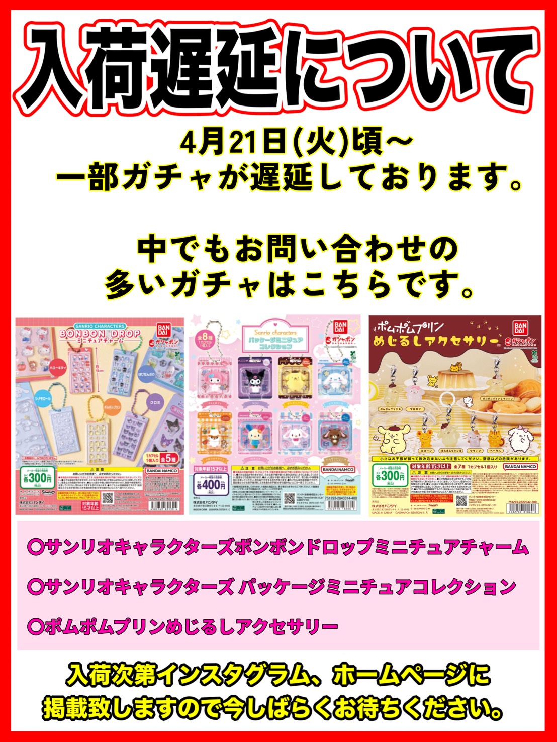 ⚫️遅延のご報告⚫️ ガチャ ガチャガチャ 2026年4月25日 ⚫️遅延のご報告⚫️ 4月中旬頃から一部ガチャが遅延しております。 中でもお問い合わせの多いガチャはこちらになります。 入荷次第SNS、ホームページに掲載致しますので今しばらくお待ちください。