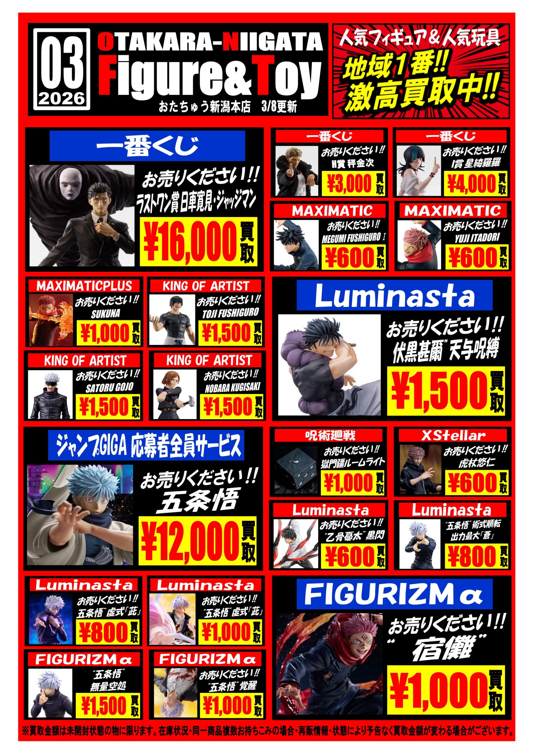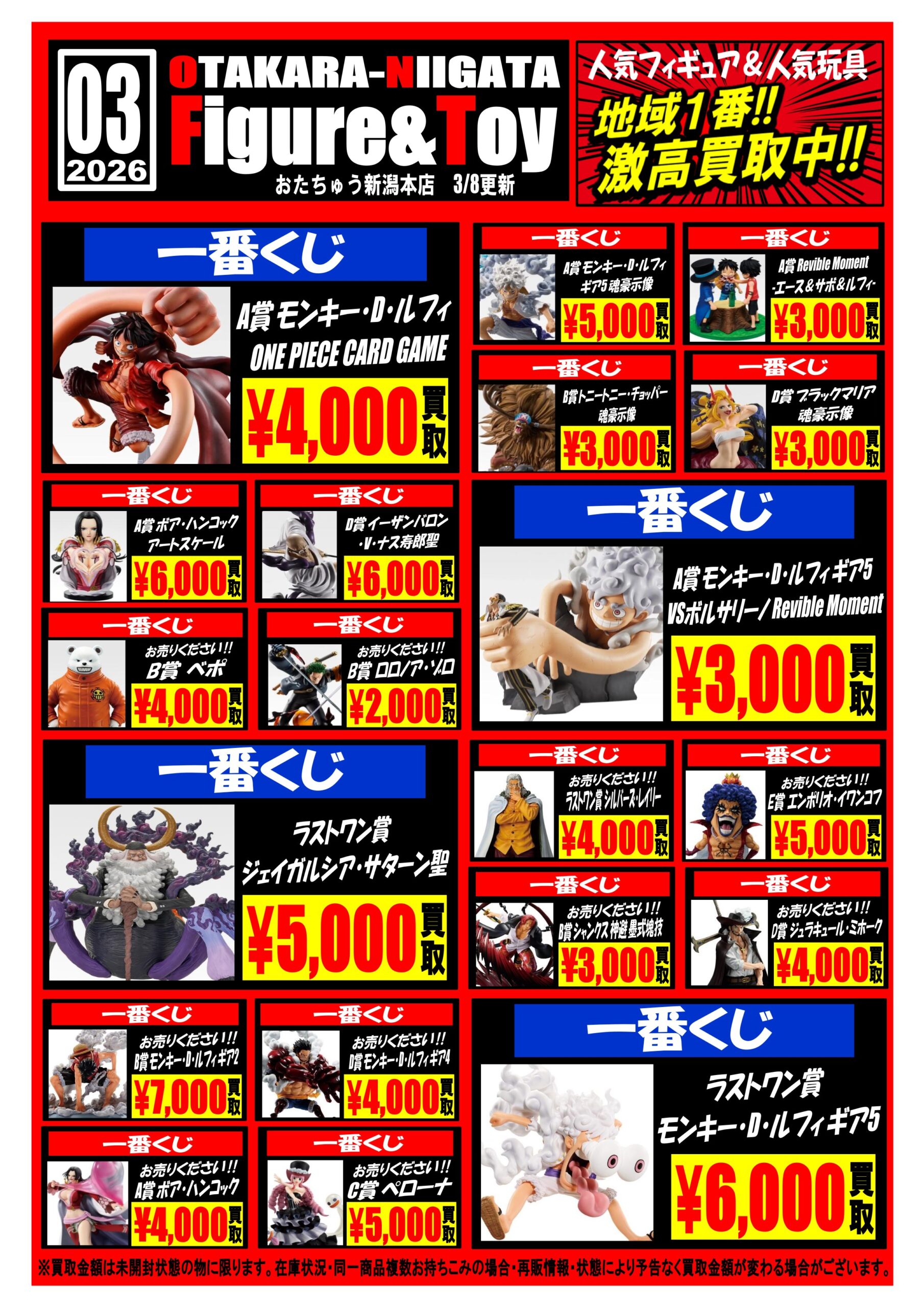おもちゃコーナーより買取チラシ更新のお知らせです🌸✨️ おもちゃ 買取情報 2026年3月8日 【呪術廻戦】 【ワンピース】 該当商品がございましたらぜひ、おたちゅう新潟本店まで🙌🏻✨️ 該当外の商品もどしどしお持ちくださいませ🔥 皆様のご来店お待ちしております😆 ※2026/3/8現在の価格となります。 在庫状況・状態によってお値段が変動いたします。予めご了承ください。 **************** こちら↓もぜひチェックしてみてくださいね🎵 ・最新のイベント情報はこちら ・最新の買取情報はこちら