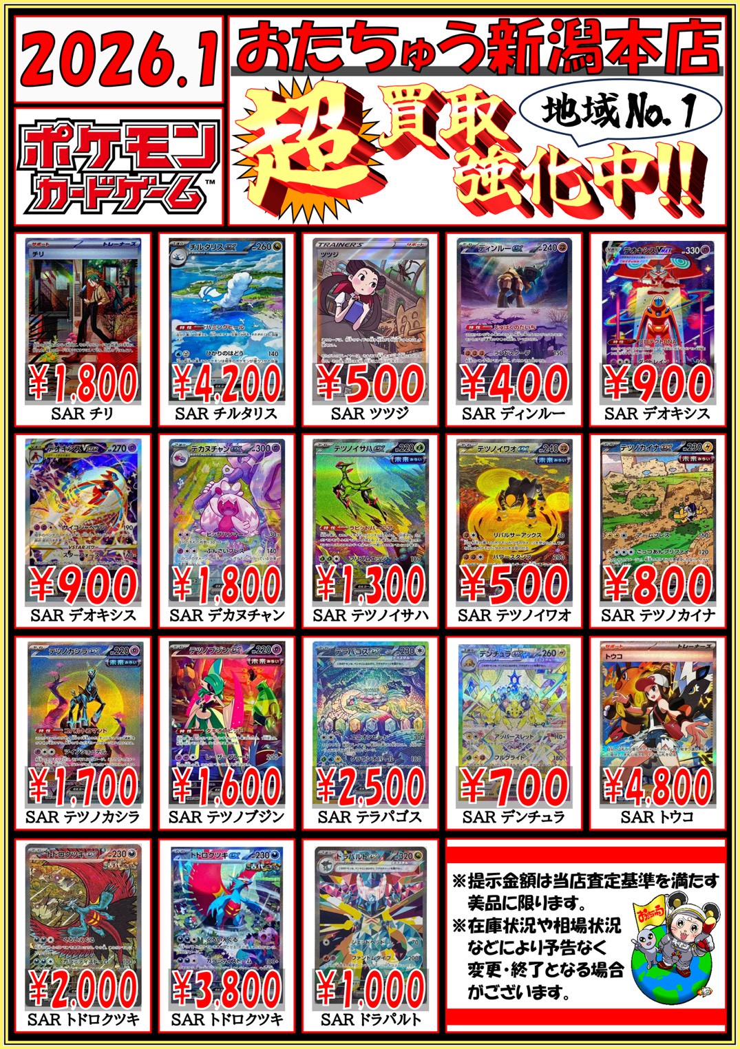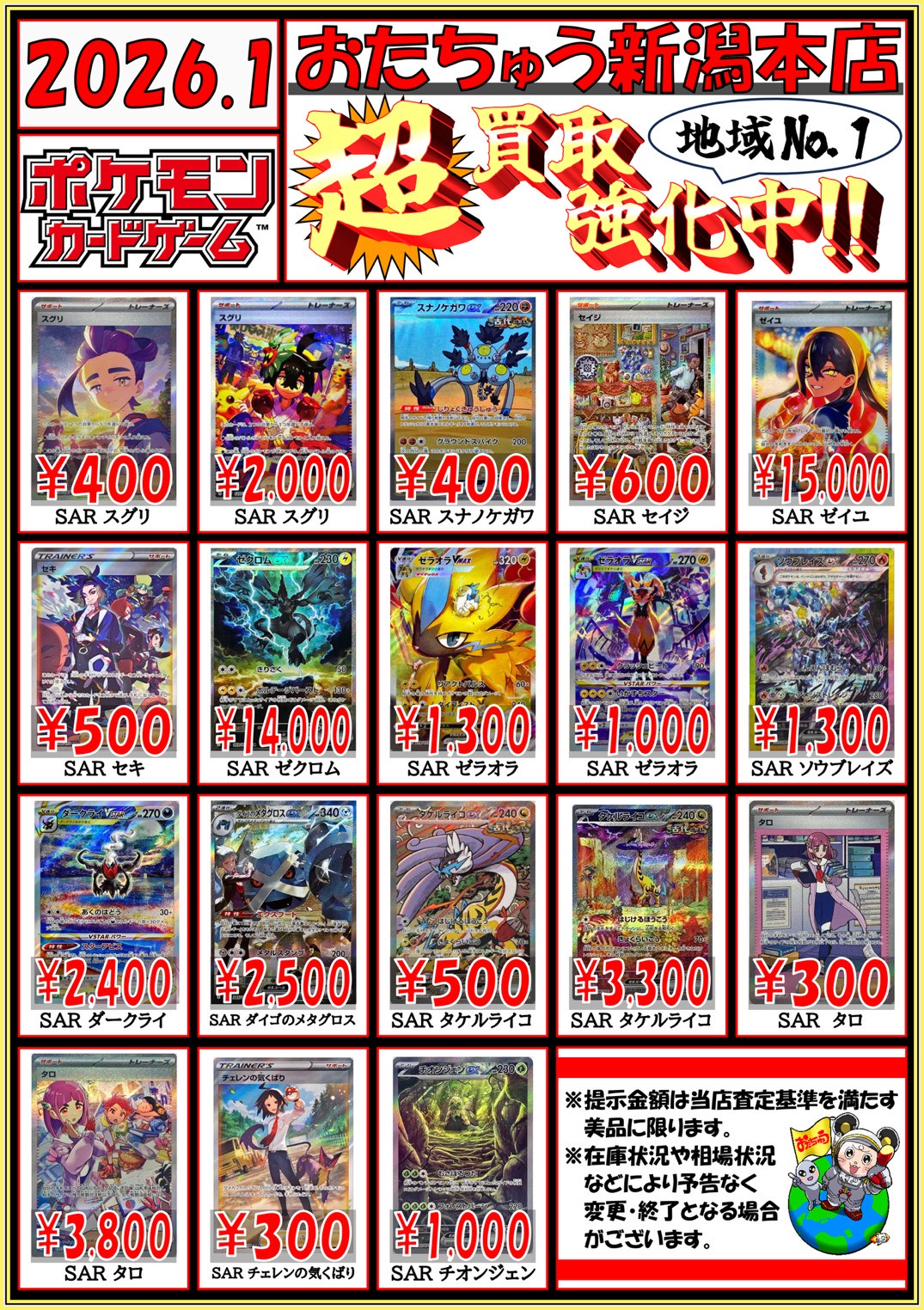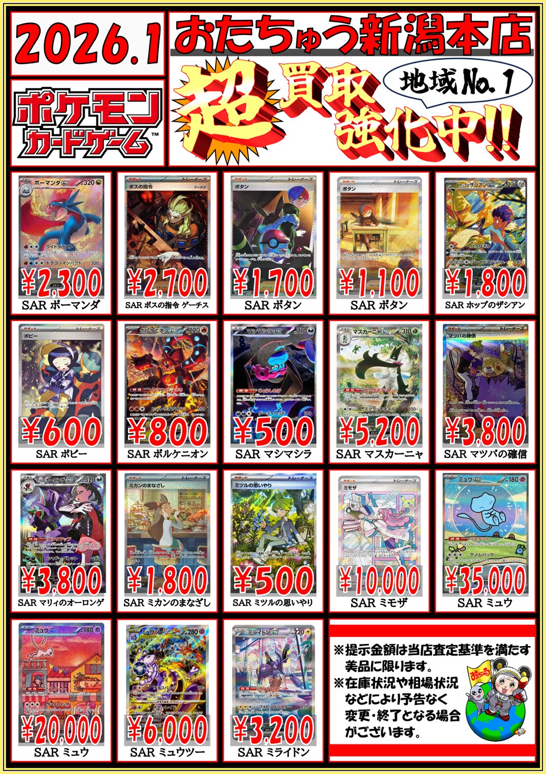 ★ポケカチラシ更新いたしました!★ カード 買取情報 2026年1月9日 カードコーナーより ポケカチラシ更新いたしました! おたちゅう新潟本店ではポケカを大大大募集中です! 告知内・外含めたくさんのお持ち込みをお待ちしております! ※2026/1/9 現在の価格となります。 在庫状況などによってお値段が変動いたします。予めご了承ください。