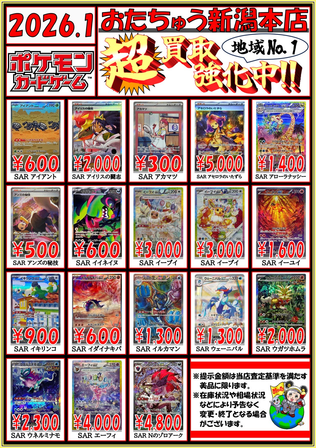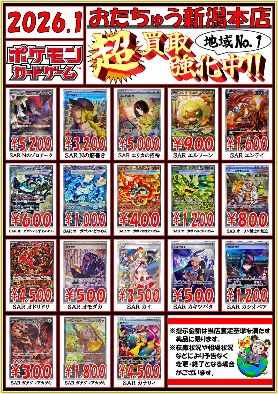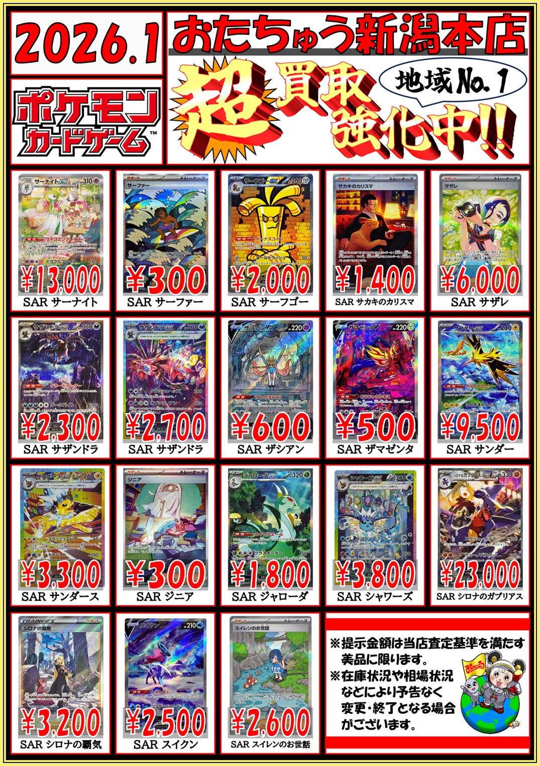 ★ポケカチラシ更新いたしました!★ カード 買取情報 2026年1月9日 カードコーナーより ポケカチラシ更新いたしました! おたちゅう新潟本店ではポケカを大大大募集中です! 告知内・外含めたくさんのお持ち込みをお待ちしております! ※2026/1/9 現在の価格となります。 在庫状況などによってお値段が変動いたします。予めご了承ください。