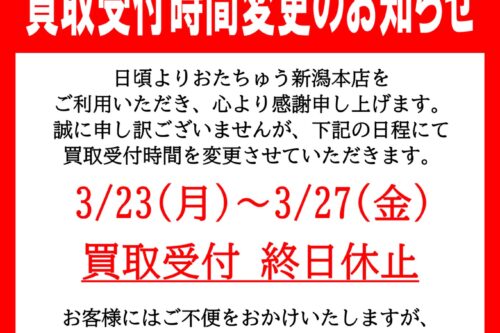 【買取受付時間についてのお知らせ】買取スタッフ不在の為、3/23(月)~3/27(金)の買取受付を終日休止させていただきます。
