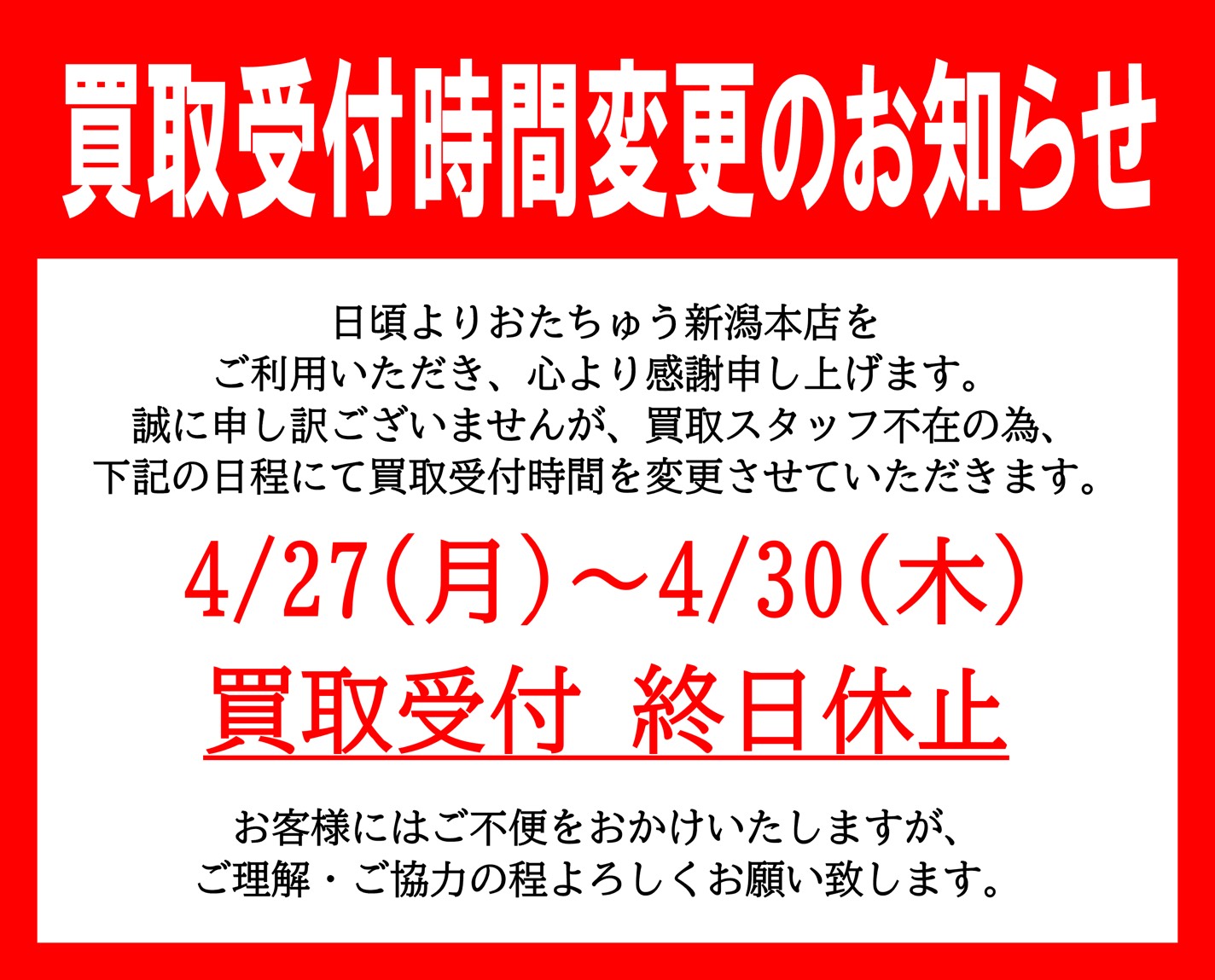 【4/27(月)~4/30(木】買取受付時間についてのお知らせ お知らせ 2026年4月27日 誠に申し訳ございませんが、買取スタッフ不在の為、4/27(月)~4/30(木)の買取受付を終日休止させていただきます。 ご利用のお客様には大変ご不便をおかけ致しますがご了承くださいますようお願い申し上げます。