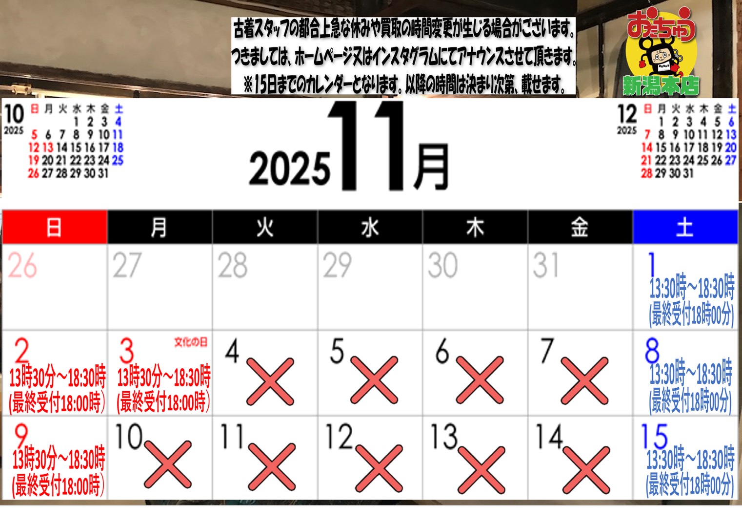 【重要】《10月18日~11月30日》買取受付時間変更のお知らせ【重要】
