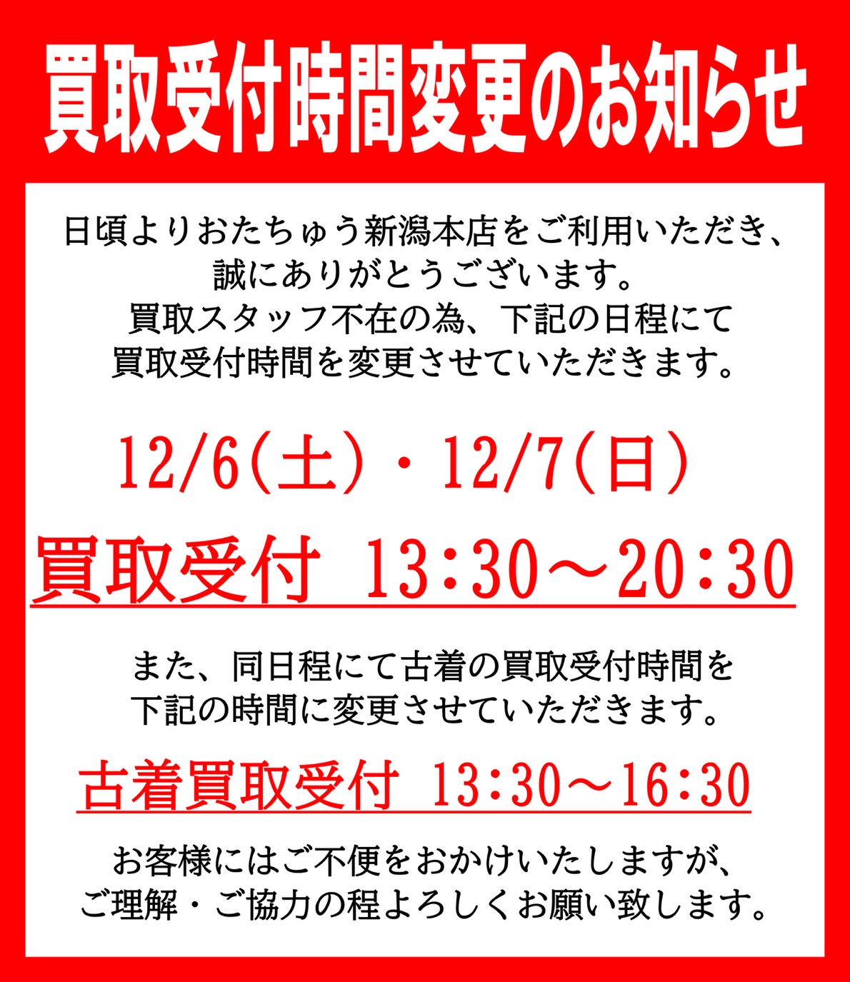 ★《12月6日・7日》買取受付時間変更のお知らせ★ お知らせ 買取情報 2025年12月6日 ★買取受付時間変更のお知らせ★ 買取スタッフ不在の為、12/6(土)・12/7(日)の買取受付時間を13:30~20:30に変更させていただきます。 また、同日程にて古着の買取受付時間を13:30~16:30に変更させていただきます。 ご迷惑をお掛けして申し訳ございません。 何卒よろしくお願い致します。