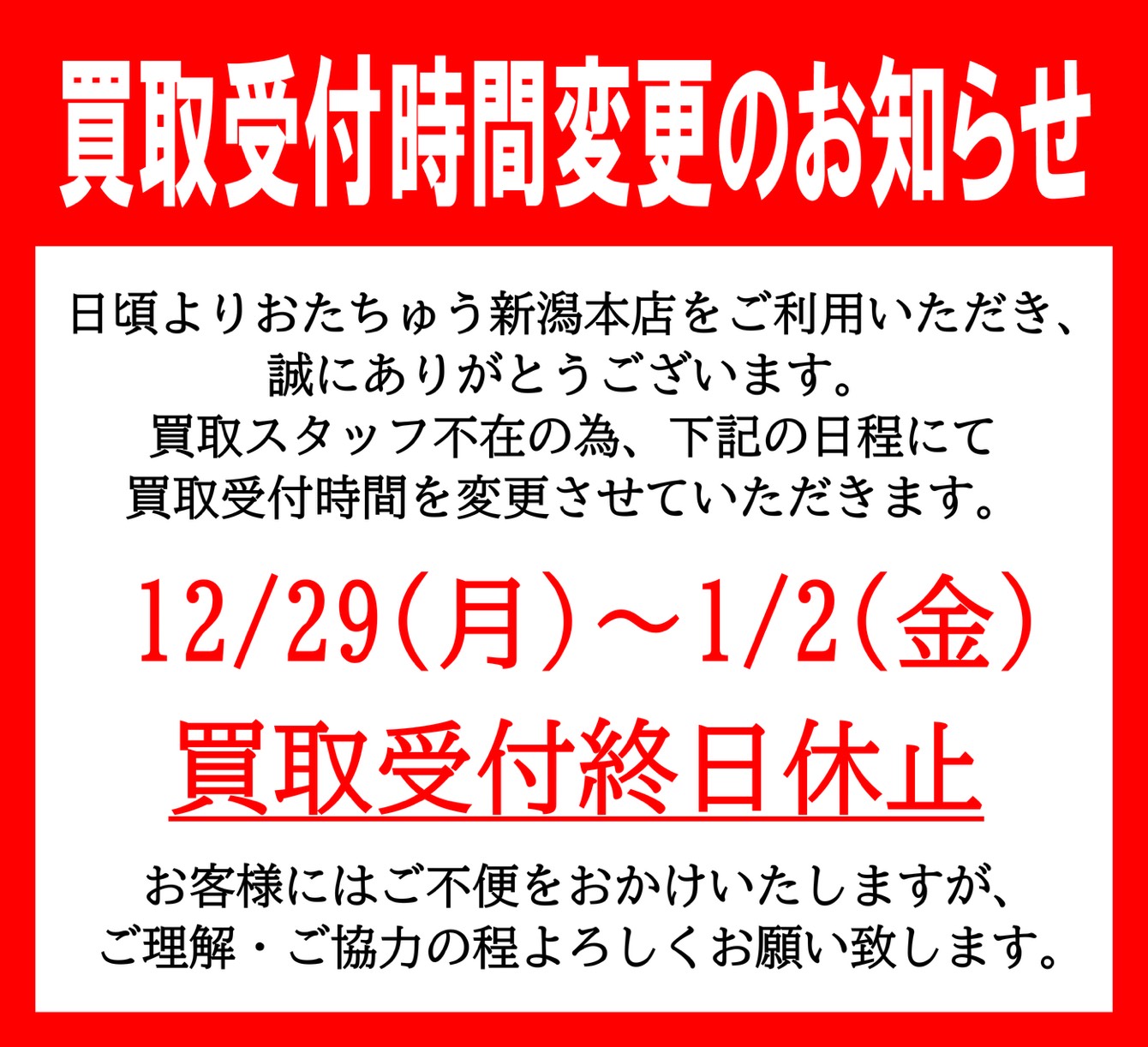 年末年始買取についてのお知らせ。買取スタッフ不在のため、12/29(月)~1/2(金)の買取を終日休止させていただきます。 お知らせ 2025年12月28日 年末年始買取についてのお知らせ 買取スタッフ不在のため、12/29(月)~1/2(金)の買取を終日休止させていただきます。 ご迷惑をお掛けして申し訳ございません。 何卒よろしくお願い致します。