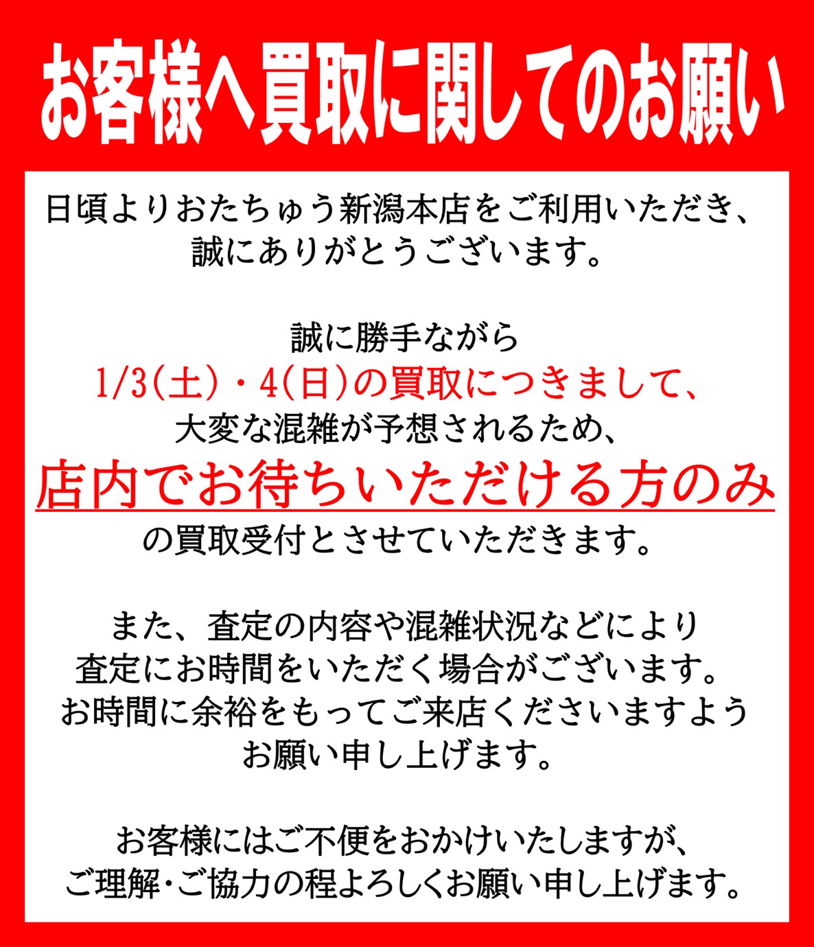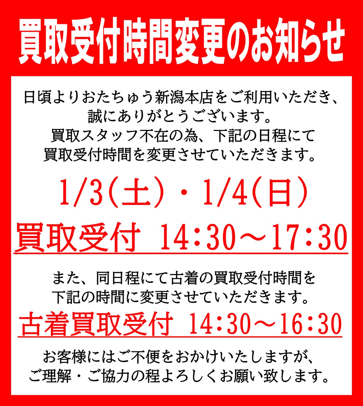 1月3日(土)・4日(日)の買取についてのお知らせ お知らせ 2026年1月3日 買取受付についてのお知らせ 買取スタッフ不在のため、1月3日(土)・4日(日)の買取受付時間を変更させていただきます。 また、買取に関するお願いもございますので合わせてご確認いただけると幸いです。 ご迷惑をお掛けして申し訳ございません。 何卒よろしくお願い致します。